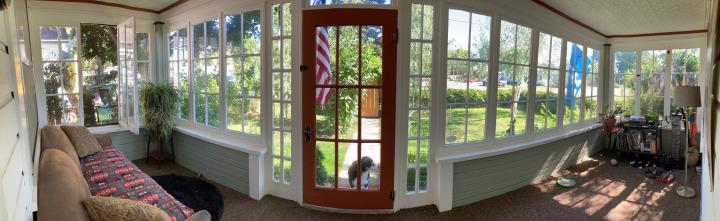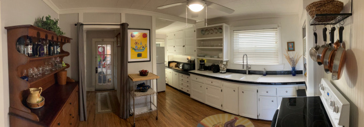 The welcoming front-entry solarium is filled with natural light and timeless character, featuring original leaded “Depression” glass that softly filters the sunlight. Screened window openings create refreshing breezeways, making this bright and inviting space a perfect place to start the day. Imagine relaxing here with your morning coffee or tea as the sunlight streams in and the blue sky welcomes a beautiful day ahead.