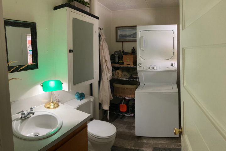 The rear half bath and laundry area offer convenient functionality in a well-organized space. It includes a stacked washer and dryer along with practical storage shelving. The bathroom features vinyl flooring, fresh paint, and a large built-in cabinet that provides ample storage for household and laundry essentials.