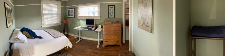 The front bedroom serves well as a second bedroom or a comfortable home office. The space can accommodate a queen-sized bed and features custom wood shelving along with a charming alcove, perfect for a wardrobe armoire or additional storage. Consistent with the rest of the home, the room is finished with crown molding, fresh paint, and flooring, creating a clean and cohesive look throughout.