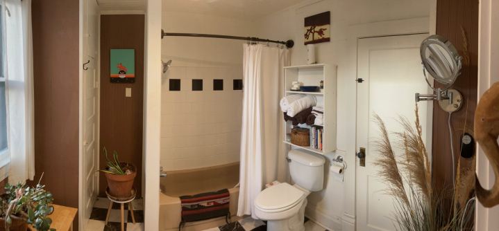The main bathroom blends classic character with thoughtful updates. It features matching white subway tile in the shower and an original cocoa-brown cast iron bathtub that adds timeless charm. New checkerboard mosaic tile flooring provides a stylish, vintage-inspired touch. The space also includes two floor-to-ceiling storage cabinets, offering ample room for linens and essentials.